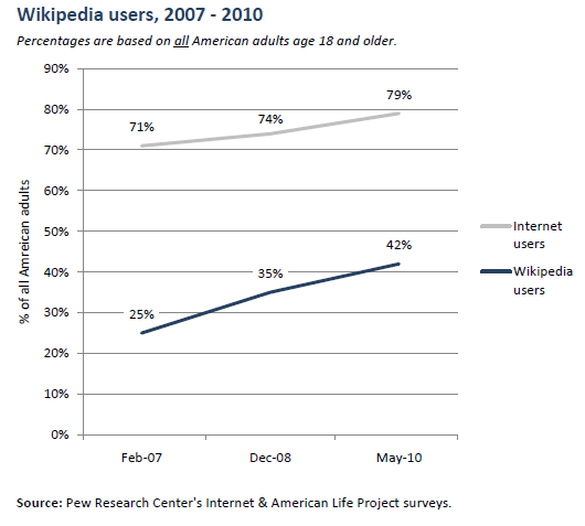 El 15 de enero de 2001 nadie imaginaba que Wikipedia.org podía convertirse en uno de los principales sitios de consulta. Ahora, con 10 años en la red, el 42% de usuarios estadounidenses son usuarios de este sitio, según un informe publicado hoy por Pew Internet. Esta cifra alcanzaba el 25% en 2007.Seguir leyendo