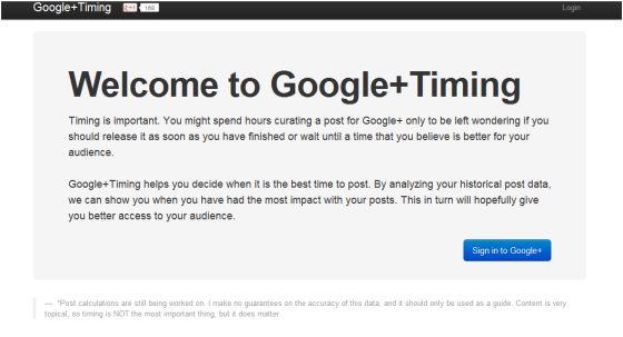 Google+ Timing, aplicación creada por Daniel Treadwell, analiza la cantidad de post publicados en tu cuenta, los más populares, el promedio de publicación por hora y por día.