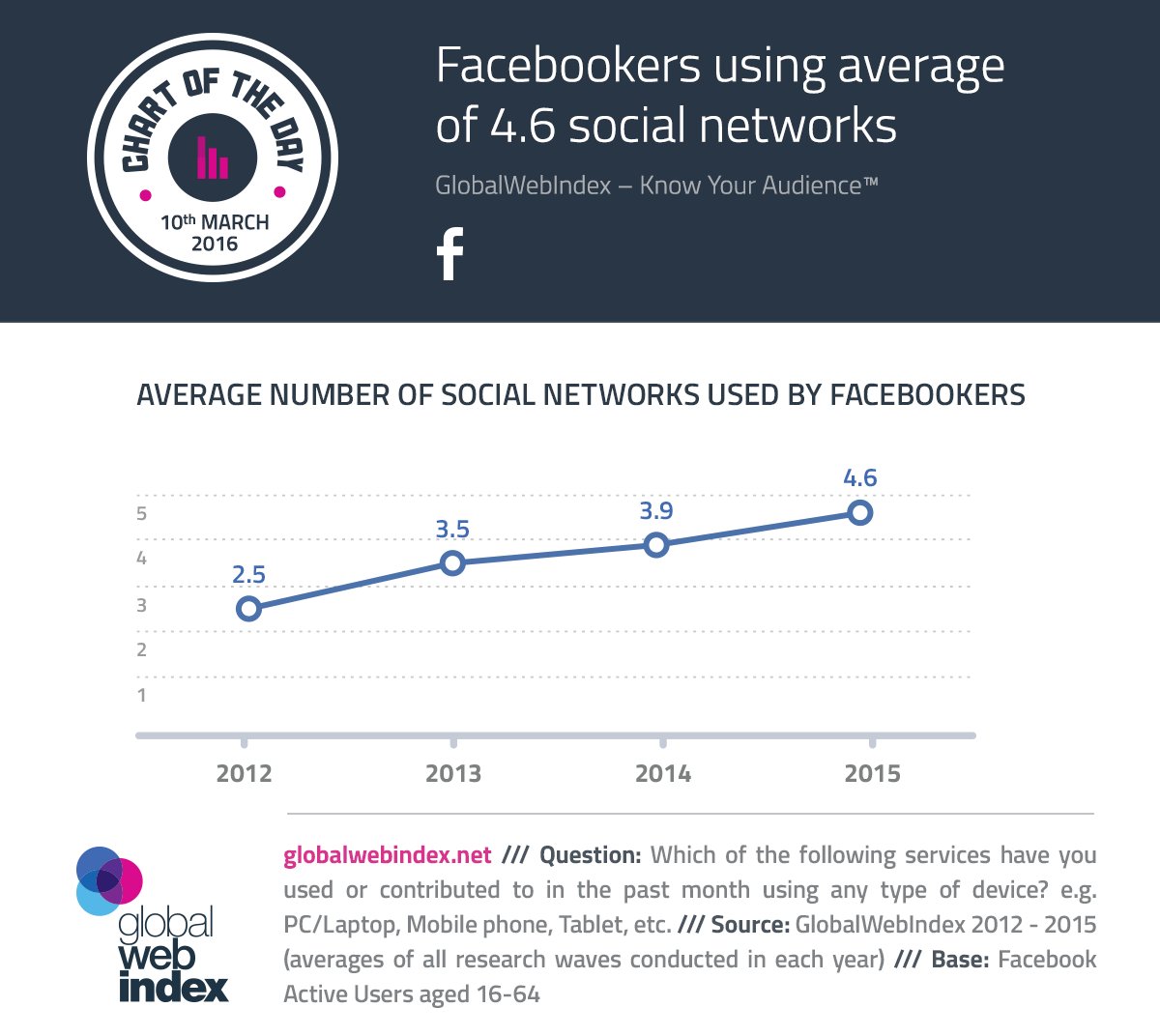 En el 2013, se elevó a 3.5 perfiles de redes sociales y luego llegó a 3.9 en el 2014.