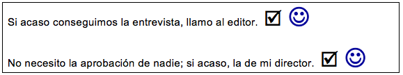- Si acaso, como locución conjuntiva condicional, expresa la posibilidad o contingencia de lo manifestado por el verbo. Como locución adverbial, significa ‘en todo caso’, ‘a lo sumo’.