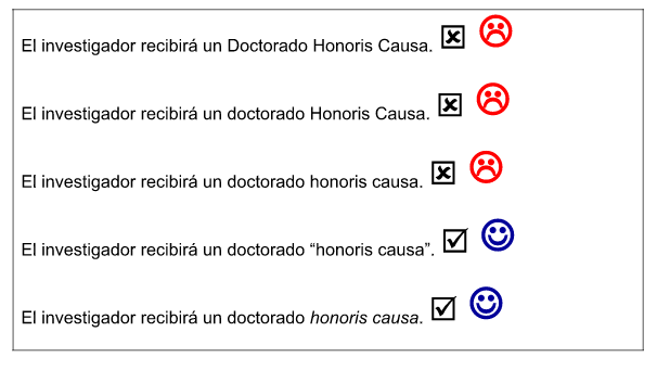 • Honoris causa significa literalmente ‘por razón o causa de honor’. Como señala el Diccionario panhispánico de dudas, se aplica a la distinción o título (generalmente un doctorado) en reconocimiento a méritos especiales’. Se escribe en minúscula y con marca tipográfica (cursiva o comillas).