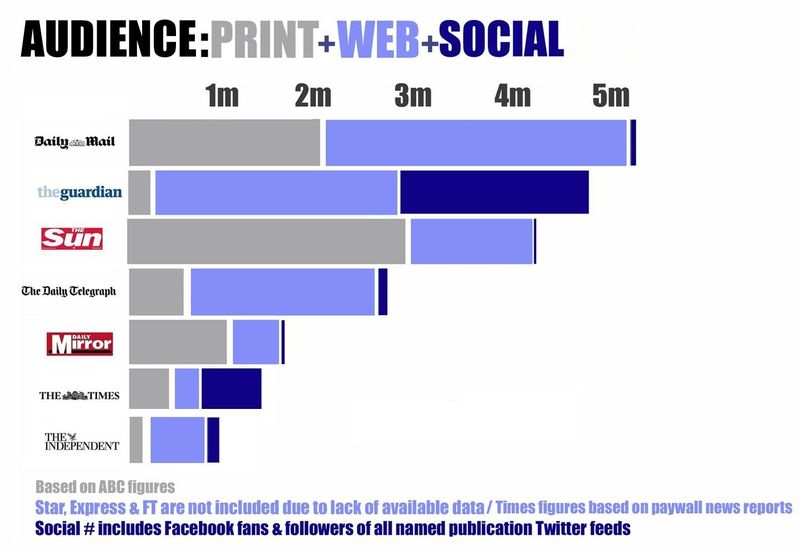 En ese cuadro podrán ver que hay tres barras de diversos colores. El gris representa la cantidad de diarios vendidos; el azul claro, la cantidad de páginas vistas; y el azul oscuro, el número de usuarios en Twitter y Facebook. Los datos fueron recogidos por un estudio de las compañías ABC y ABCe online. De igual forma, el autor revisó los sitios de social media de cada diario.