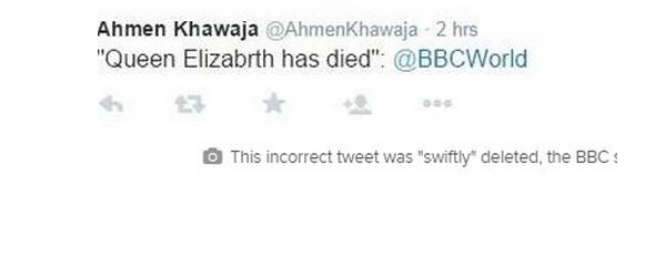 «Queen Elizabrht (sic) has died» @BBCWorld. El tuit de la periodista de la cadena británica Ahmen Khawaja reventó en Twitter, y los medios se lo devoraron, desde CNN Newsource hasta el diario alemán Bild retuitearon.
