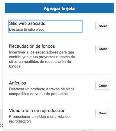 Haz clic en «Añadir tarjetas» y luego podrás elegir entre Sitio web asociado, Recaudación de fondos (incentivar a los espectadores para que contribuyan a tus proyectos a través de sitios compatibles de recaudación de fondos), Artículos, así como Video o lista de reproducción.