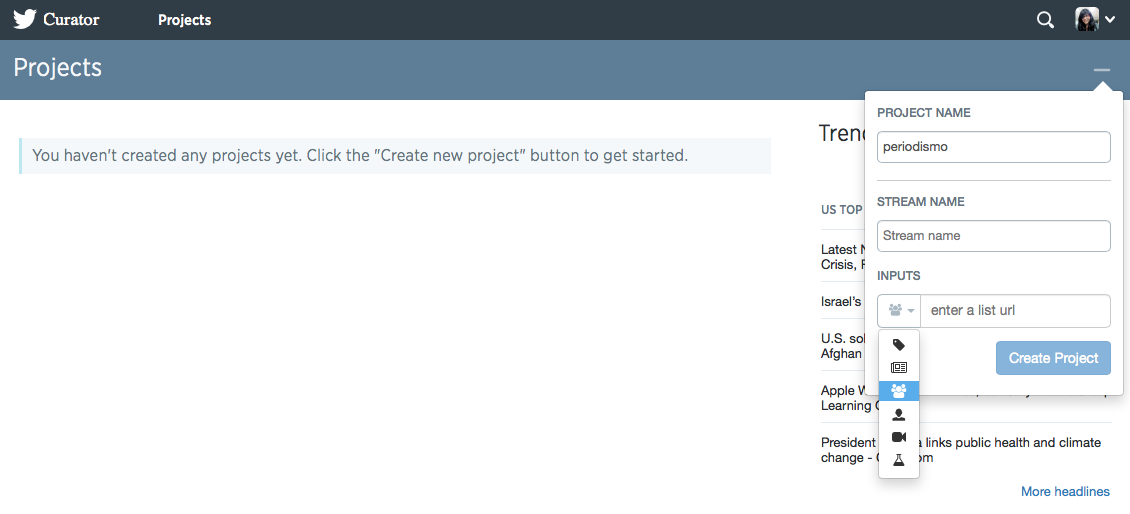 Para empezar, se puede crear un proyecto. Luego de loguearte solo debes incluir un nombre y elegir un elemento para monitorear. Puede ser un término o una lista que ya tengas afiliada a tu cuenta.