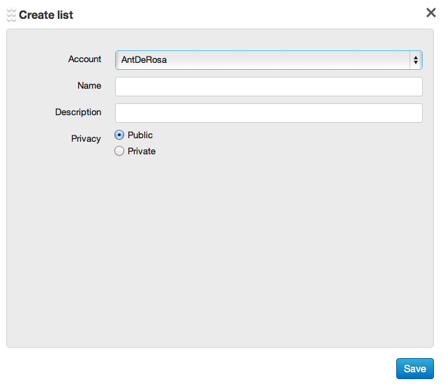 3. Elige la cuenta con la que quieres crear una lista en la parte inferior. Luego crea un nombre a la lista y agrega una descripción. Decide si será pública o privada.