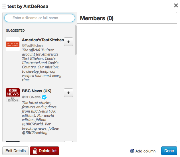 5. Una vez que guardes la lista, ya podrás agregarla como una columna. Si deseas agregar a alguien a tu lista, haz clic en el avatar de Twitter como aparece en la cubierta del tuit. A continuación, haz clic en el icono del perfil y luego «Agregar o quitar de las listas» en el menú.