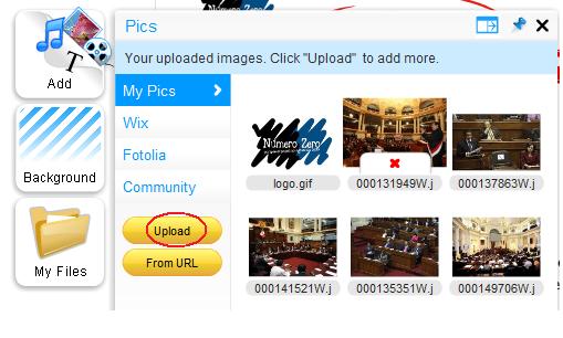 8. Si queremos insertar imágenes, vamos a Add-Pics. Para subir nuestras imágenes al trabajo hacemos clic en ‘Upload’ y buscamos nuestros archivo.