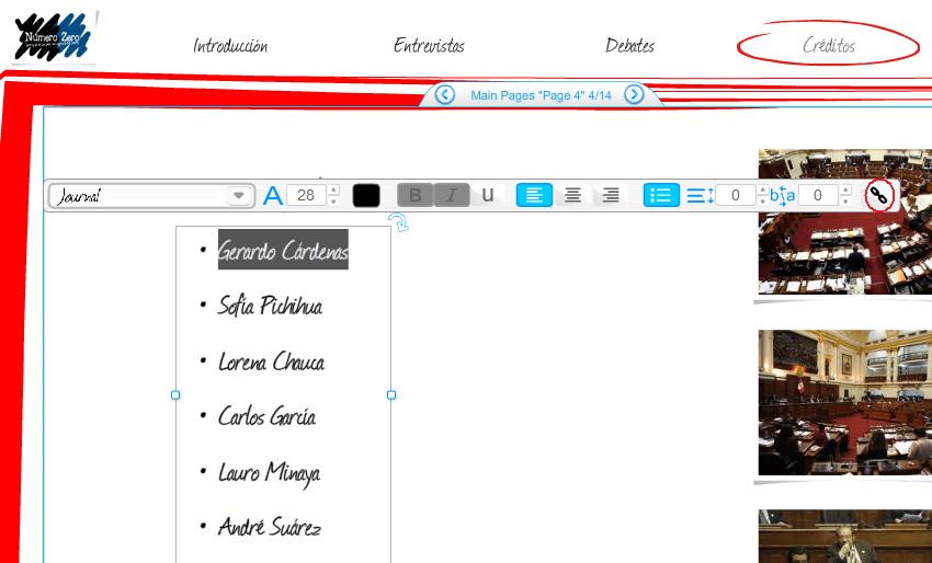 9. Ahora pasamos a ‘Créditos’, donde también subiremos imágenes y texto. La diferencia es que esta vez enlazaremos nuestro texto a contenido externo. Para hacerlo, sombreamos lo que vamos a editar y hacemos clic encima del símbolo de la cadenita: