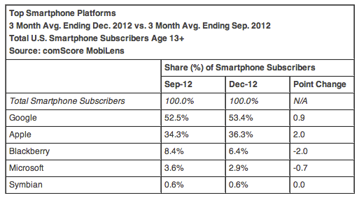 No se detiene. El iPhone de Apple posee el 36.3% del mercado de smartphones en EE.UU., según un estudio de comScore realizado en diciembre 2012. Esto refleja un crecimiento de 2% respecto a un análisis de septiembre.