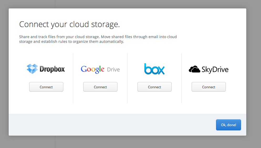 Funciona directamente con 4 servicios dela nube: Dropbox, Box, SkyDrive y Drive. Se sugiere usar uno o dos servicios. La ventaja que ofrece esta app es la revisión de archivos en una plataforma ordenada, muy similar a una bandeja de entrada.
