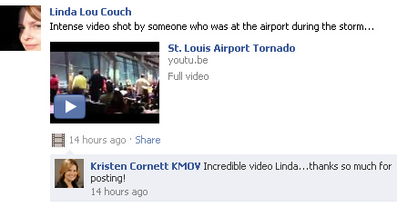 KMOV.com utilizó su página de Facebook para la cobertura del tornado que afectó ayer el aeropuerto de St. Louis, en Estados Unidos. Se publicó información en tiempo real, mucho más que en Twitter.