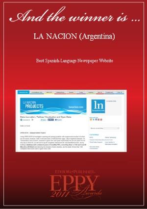 Lanacion.com obtuvo ayer un premio EPPY Award 2011 como el mejor sitio web de noticias en español. El galardón lo entrega el prestigioso sitio estadounidense Editor & Publisher.