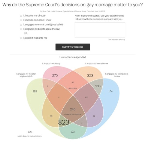 El medio diseñó una especie de flor interactiva en donde, lo que serían los pétalos, mostraban el número y las respuestas que el Post proponía para saber la incidencia que tiene este fallo en la vida de los ciudadanos. Y también ideó un espacio para que los usuarios opinaran libremente sobre este caso.