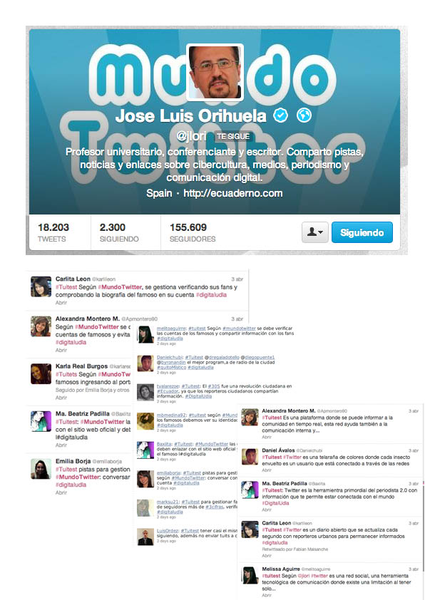 Nada mejor que la experiencia para fijar el conocimiento. Por eso, Twitter se aprende tuiteando. Sin embargo, siempre hace falta partir de un marco teórico y qué mejor referencia que la de un libro insignia como Mundo Twitter, del maestro José Luis Orihuela. En ese contexto, conjugando las dos dimensiones, me lancé a proponer a mis estudiantes de Periodismo de la UDLA, un ejercicio un tanto arriesgado. Se trató de un #Tuitest para el que acordamos las siguientes reglas: