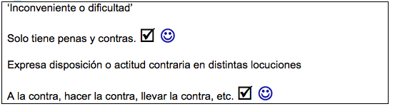 A continuación, algunos consejos para el uso de estas preposiciones. Contra Esta preposición puede usarse como sustantivo femenino con los siguientes sentidos: