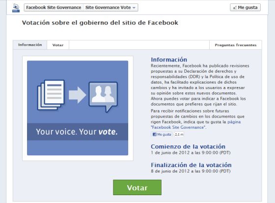«Los usuarios pueden votar entre adoptar las versiones revisadas de nuestra Declaración de derechos y responsabilidades, y nuestra Política de uso de datos o mantener las versiones existentes de dichos documentos», señala el sitio Facebook Site Governance Vote.